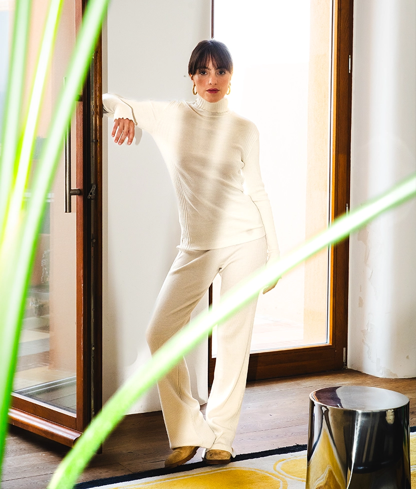 La matière est tiricotées sur d’anciens métiers tubulaires. Ces machines uniques permettent de créer des tricots sans couture, évitant ainsi au produit de se déformer, ce qui garantit une stabilité et une durabilité exceptionnelles. Ce procédé de tricotage exige une expertise et une précision pour atteindre un haut niveau de finition. Le montage des pièces est ensuite réalisé quasi artisanalement.