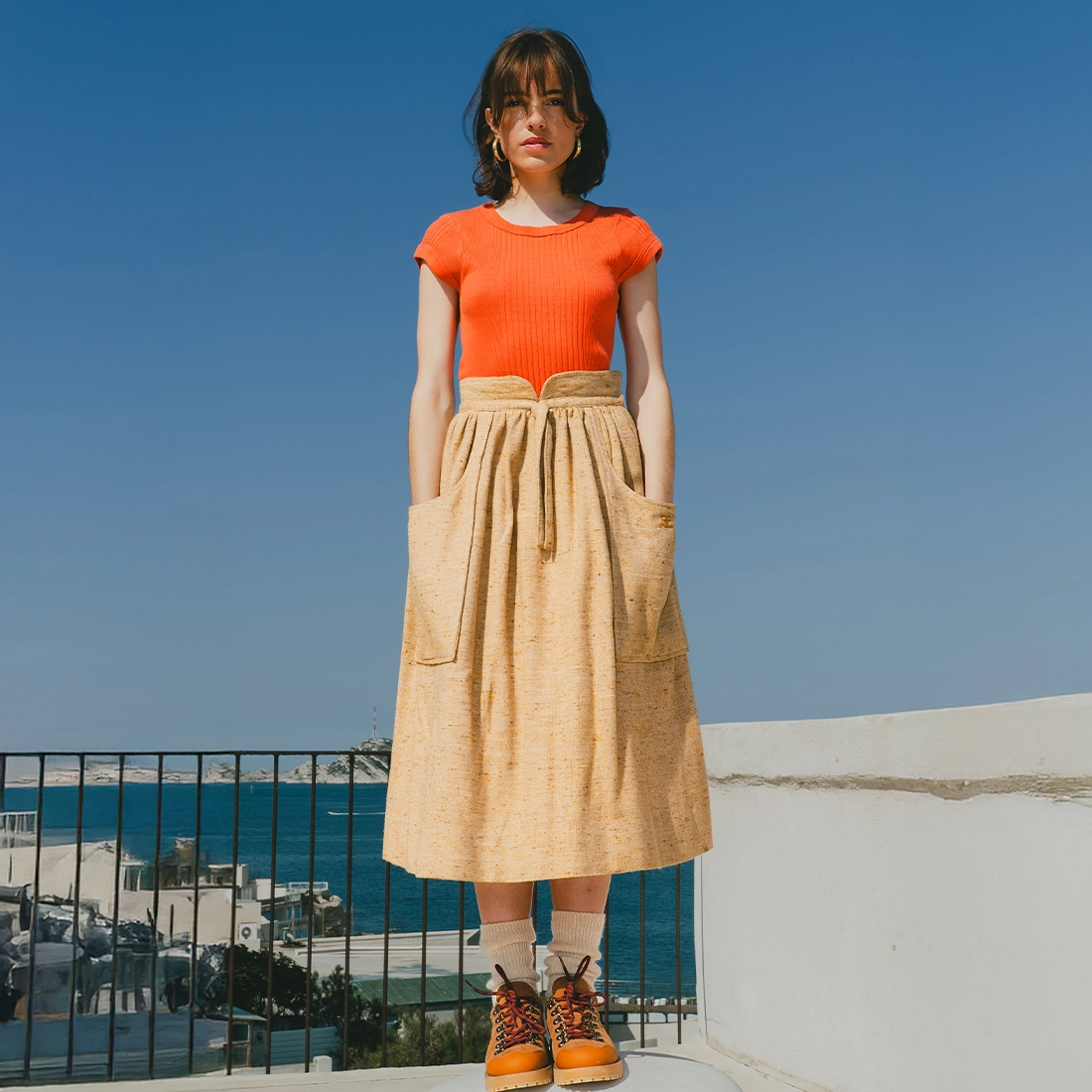 La matière est tiricotées sur d’anciens métiers tubulaires. Ces machines uniques permettent de créer des tricots sans couture, évitant ainsi au produit de se déformer, ce qui garantit une stabilité et une durabilité exceptionnelles. Ce procédé de tricotage exige une expertise et une précision pour atteindre un haut niveau de finition. Le montage des pièces est ensuite réalisé quasi artisanalement.